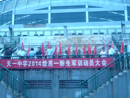 動員大會在莊嚴(yán)的國歌聲中拉開帷幕。首先由馬曉林校長致歡迎辭,他代表天一中學(xué)向新加入一中大家庭的所有新同學(xué)表示衷心的祝賀,對全體教官們,表示最熱烈的歡迎和誠摯的感謝。他指出,軍訓(xùn)是踏入校門的第一課,要求大家吹響刻苦爭先、向勝利進(jìn)軍的號角,用汗水去耕耘,用勤奮去收獲,共同創(chuàng)造美好的明天。他滿懷激情地介紹了我校的優(yōu)良校風(fēng)和辦學(xué)目標(biāo),特別是我校今年高考所取得的優(yōu)異成績。他強(qiáng)調(diào),軍訓(xùn)工作是一項國防軍事教育活動,在全面推進(jìn)素質(zhì)教育、促進(jìn)學(xué)生健康成長方面,具有其他教育不可替代的作用。他也向同學(xué)們提出幾點(diǎn)軍訓(xùn)要求,堅信軍訓(xùn)必將在同學(xué)們的人生道路上留下深深的印記。之后,軍訓(xùn)教官代表李教官、2014級高一新生代表周昱新、教師代表戴鳳帥先后作了發(fā)言。最后,與會的各位領(lǐng)導(dǎo)向各軍訓(xùn)連隊授旗,由徐杰校長宣布軍訓(xùn)正式開始。