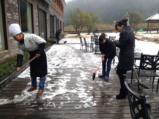 為了保證顧客和員工出入安全,酒店于2月2日上午組織員工掃雪。盡管天氣寒冷,但全體職工熱情高漲、干勁十足,大家團(tuán)結(jié)合作,在短短2個(gè)小時(shí)內(nèi)已將酒店門前后院的積雪清理干凈。