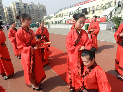禮文化是華夏文化的核心,冠禮和笄禮是一個新的成人第一次踐行華夏禮儀, 也是冠者進入華夏禮儀系統(tǒng)的起始。所謂"冠者禮之始也",淮北市天一中學(xué)繼承并發(fā)揚這一優(yōu)良傳統(tǒng),堅持從“品”樹人,從“學(xué)”育人。自2010年6月至今,據(jù)不完全統(tǒng)計,已有5000多名學(xué)生接受天一中學(xué)成人儀式,成為頂天立地的成人。